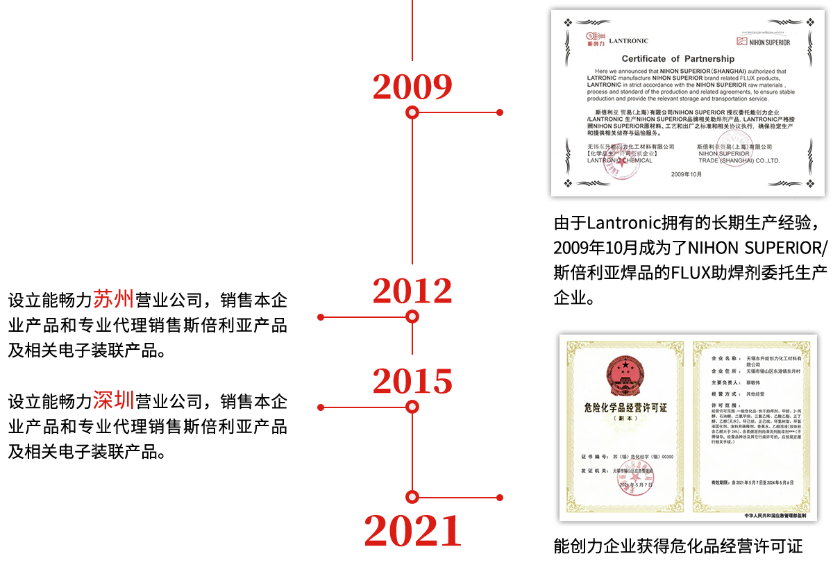 Wuxi Lantronic 能創(chuàng)力公司具有化工行業(yè)的生產許可(蘇)WH安許證字【B00431】,引進吸收,技術研發(fā),各類低固態(tài)免清洗FLUX, 水溶性FLUX,滿足電子裝聯(lián)企業(yè)以及高可靠性的軍工(航天)產品,長期應用業(yè)績。滿足更安全,高清潔度要求的水基助焊劑FLUX正不斷的獲得客戶的認可,同時在清洗劑Cleaner 方面,擁有環(huán)保型產品和更安全的水基型清洗劑。由于Lantronic擁有的長期生產經驗,2009年初成為了NIHON SUPERIOR的FLUX委托生產企業(yè)。